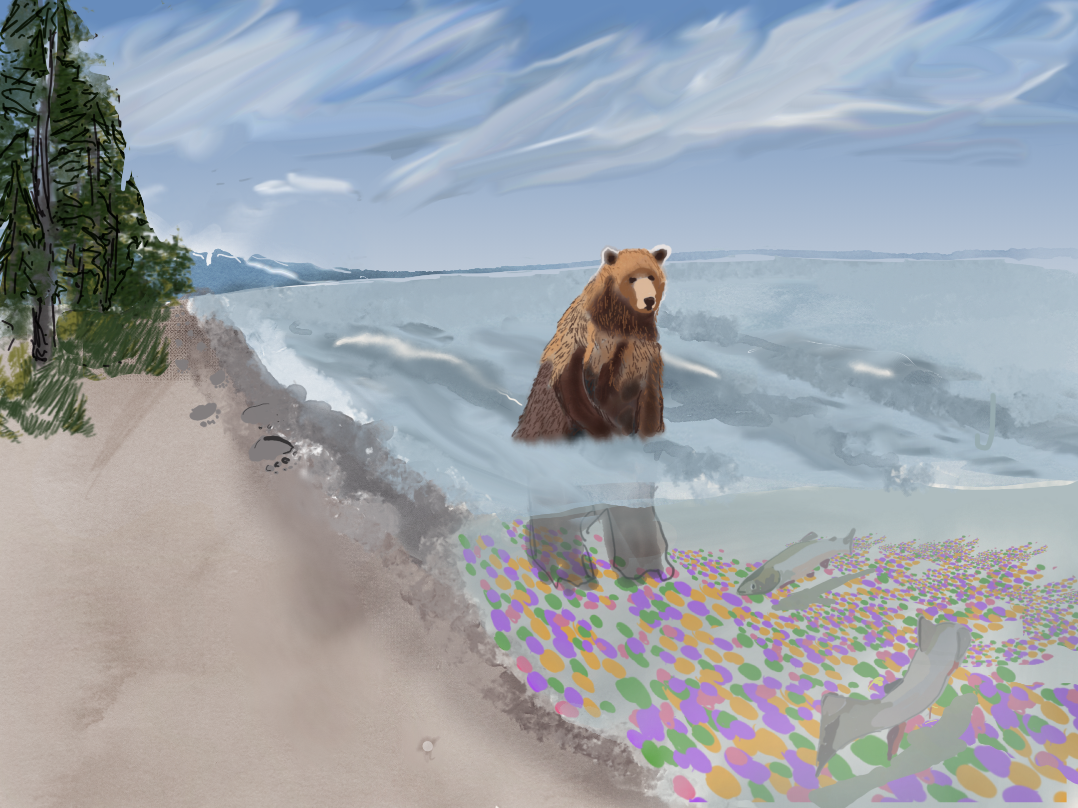 What time of day is it? What season? Why would the bear go to the lake?